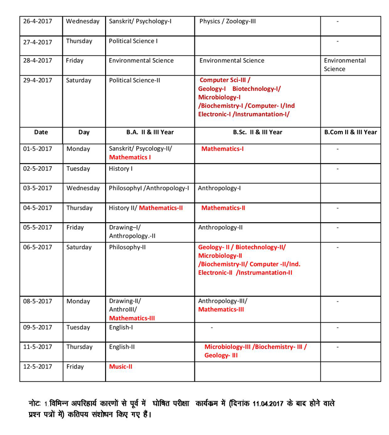यूनिवर्सिटी ने 17 अप्रैल और इसके बाद होने वाले बीए और बीएससी सेकेंड व थर्ड ईयर के एग्जाम की डेट्स बदल दी हैं। 17 अप्रैल को मैथ्स का पेपर नहीं होगा। इस दिन केवल होम साइंस का पेपर होगा। 19 अप्रैल को भी मैथ्स का पेपर नहीं होगा। केवल म्यूजिक और बॉटनी का पेपर होगा। 20 अप्रैल को म्यूजिक 2 का पेपर नहीं होगा। केवल ज्योग्राफी का एग्जाम होगा। 21 अप्रैल को परीक्षा में कोई बदलाव नहीं होगा। इसके बाद 27 अप्रैल को केवल पॉलिटिकल साइंस का पेपर होगा। बायोटेक, माइक्रोबायोलॉजी, बायोकैम, कंप्यूटर आदि के पेपर नहीं होंगे। 29 अप्रैल को केवल कंप्यूटर साइंस 3, जियोलॉजी 1, बायोटेक्नोलॉजी 1, माइक्रोबायोलॉजी 1, बायोकेमिस्ट्री 1, कंप्यूटर-1 आदि के पेपर होंगे। एक मई से होने वाली परीक्षाओं में भी बदलाव किया गया है। एक मई को संस्कृत व साइकोलॉजी के साथ ही मैथ्स1 का पेपर होगा। दो मई के बजाय तीन मई को एंथ्रोपोलॉजी का पेपर होगा। चार मई को हिस्ट्री 2 के साथ ही मैथ्स 2 का पेपर भी होगा। छह मई को फिलोसॉफी के साथ ही जियोलॉजी 2, बायोटेक 2, माइक्रोबायो 2, बायोकैम 2 आदि का पेपर होगा। आठ मई को ड्राइंग व एंथ्रो के साथ ही मैथ्स 3 का पेपर भी होगा। दस मई को इंगलिश 2 के साथ ही माइक्रोबायोलॉजी 3, बायोकैम 3 और जियोलॉजी 3 का पेपर होगा। पेपर 11 मई के बजाए 12 मई को खत्म होंगे। 12 मई को म्यूजिक 2 का पेपर कराया जाएगा।