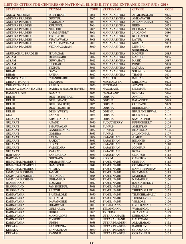 इन शहरों में होगा नीट यूजी 2018
