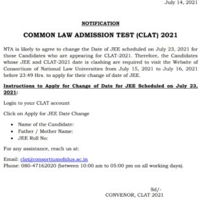 23 जुलाई को CLAT के साथ ही जेईई एग्जाम की डेट भी है। तमाम उम्मीदवारों से को को कोई एक परीक्षा छोड़नी पड़ेगी। लिहाज, कंसोर्टियम ने ऐसे कैंडिडेट से आवेदन मांगे हैं। इसके तहत ऐसे कैंडिडेट अपनी जेईई एग्जाम की डिटेल्स भेजेगा, जिसके आधार पर जेईई मेन की डेट चेंज होगी।